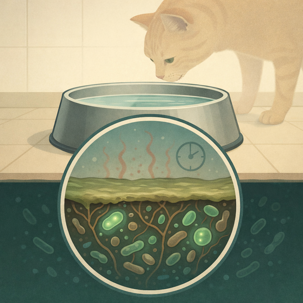 En pocas horas de llenar un cuenco normal, se forma en la superficie del agua una capa invisible de bacterias llamada "biofilm". No puedes verla ni olerla… pero tu gato sí.